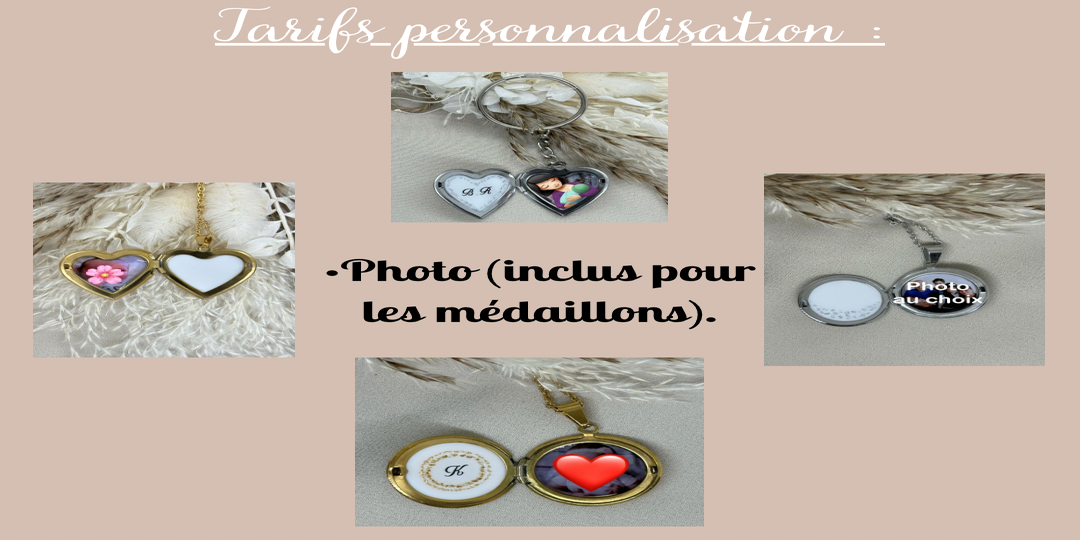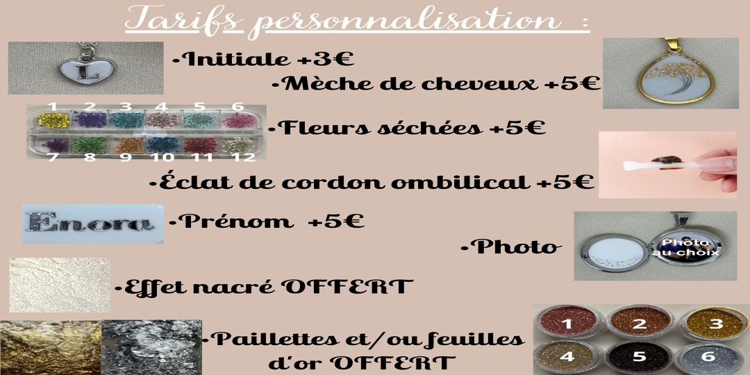 Vous avez de nombreuses façons de personnaliser votre bijou souvenir. Selon le modèle choisi, vous pouvez y ajouter une mèche de cheveux, des fleurs séchées, des initiales, un prénom, une photo ou encore des éclats de cordon ombilical. Ainsi votre bijou sera unique et totalement à votre image !