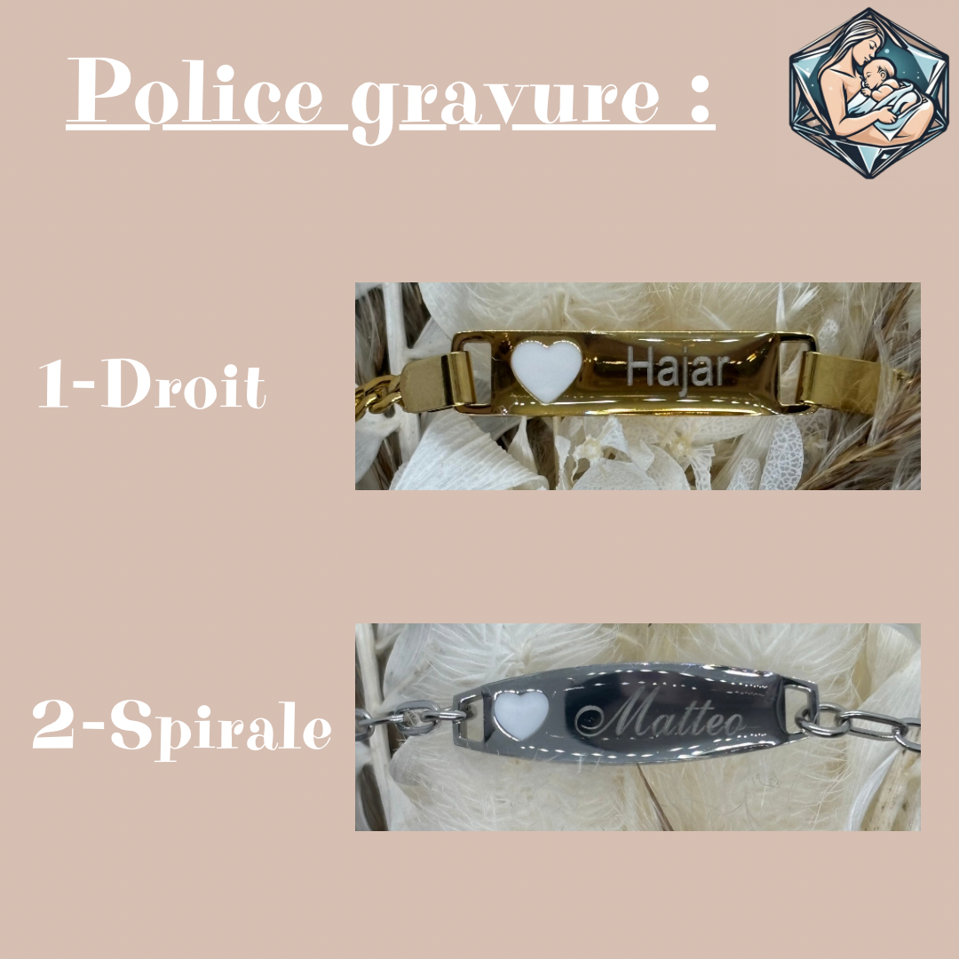 Police d'écriture pour la gravure du prénom au choix (si votre prénom comporte des accents ou caractères spéciaux, la police sera automatiquement la police 1-Droit).