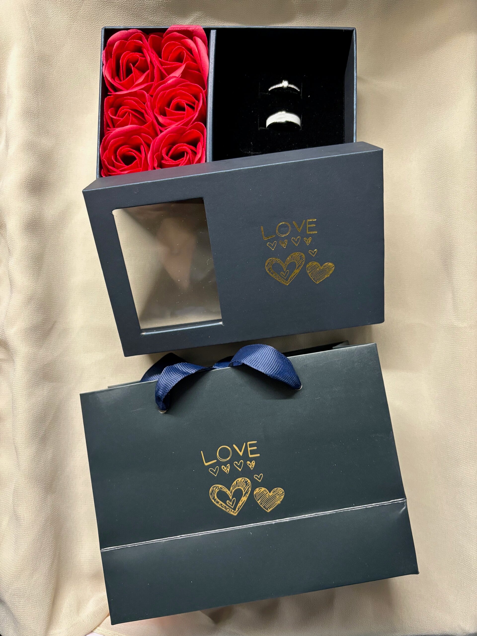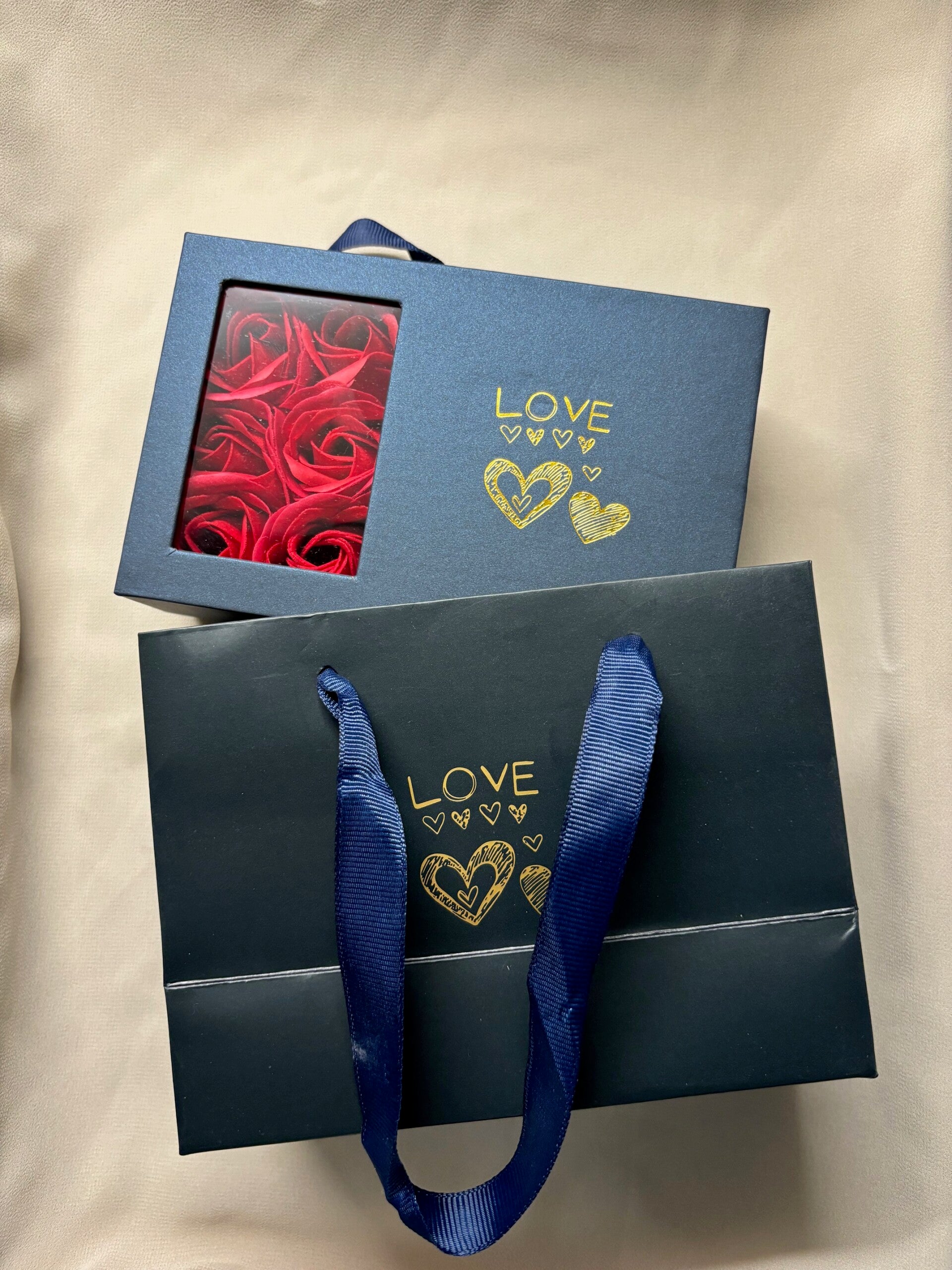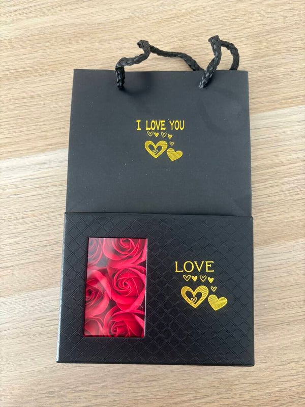 Coffret cadeau avec son sac assorti contenant 6 roses de savons parfumées et un emplacement dédié à vos bijoux lactés (non inclus).