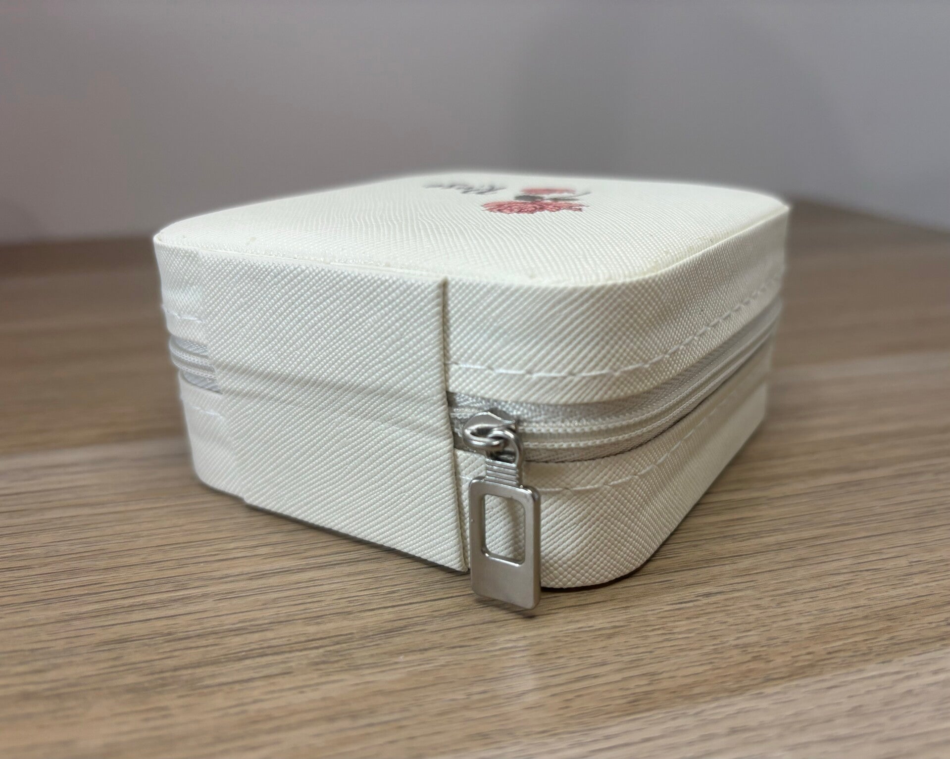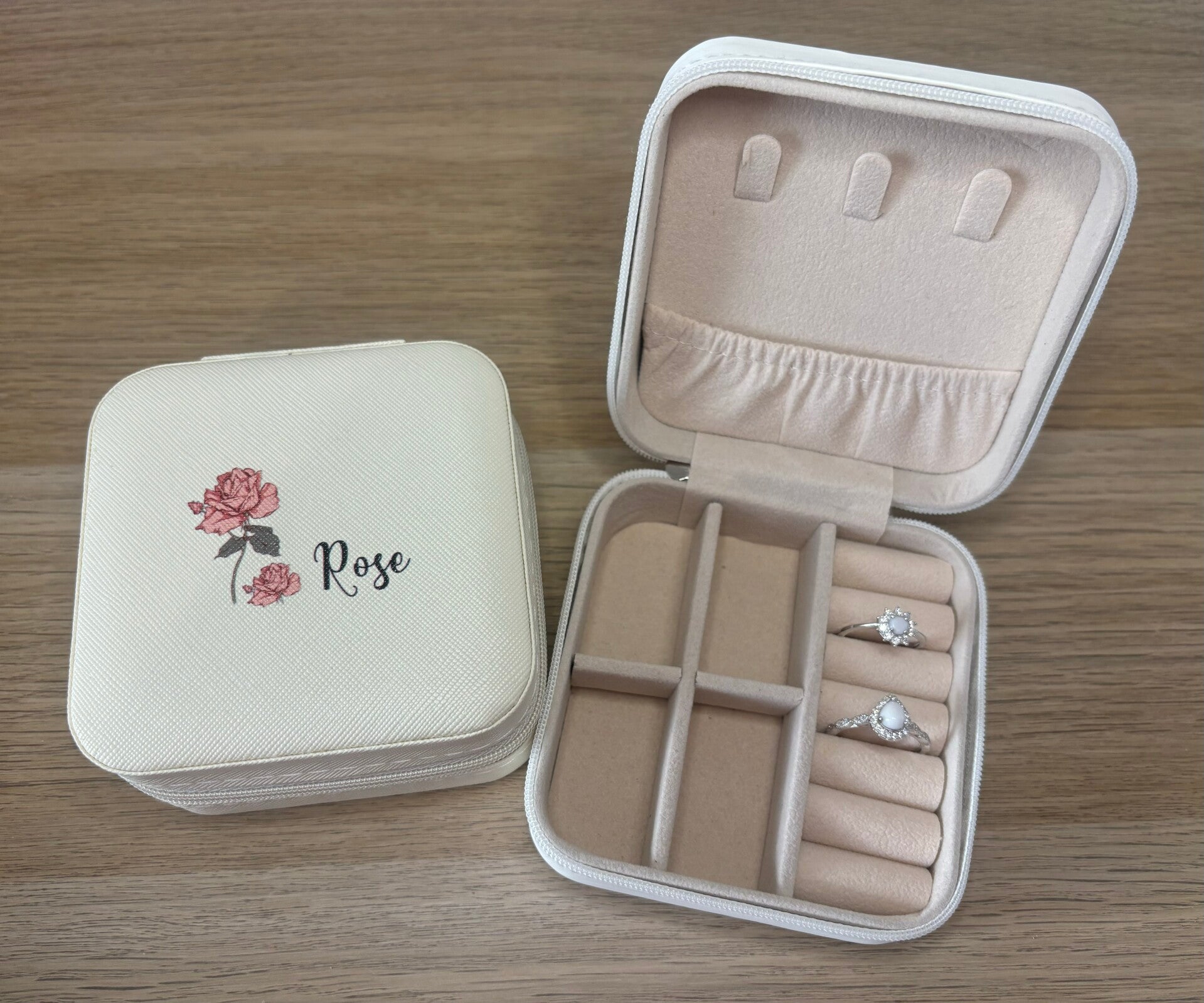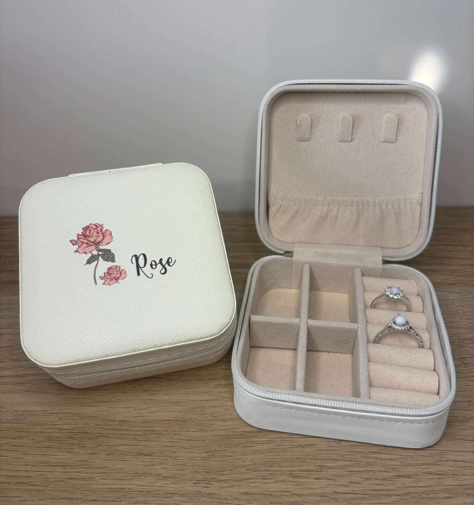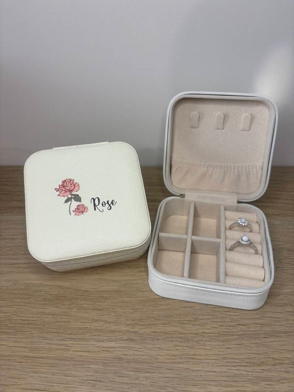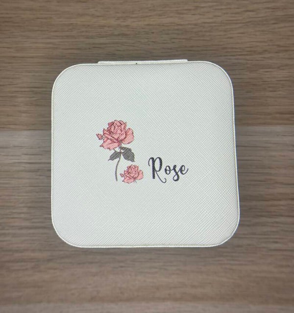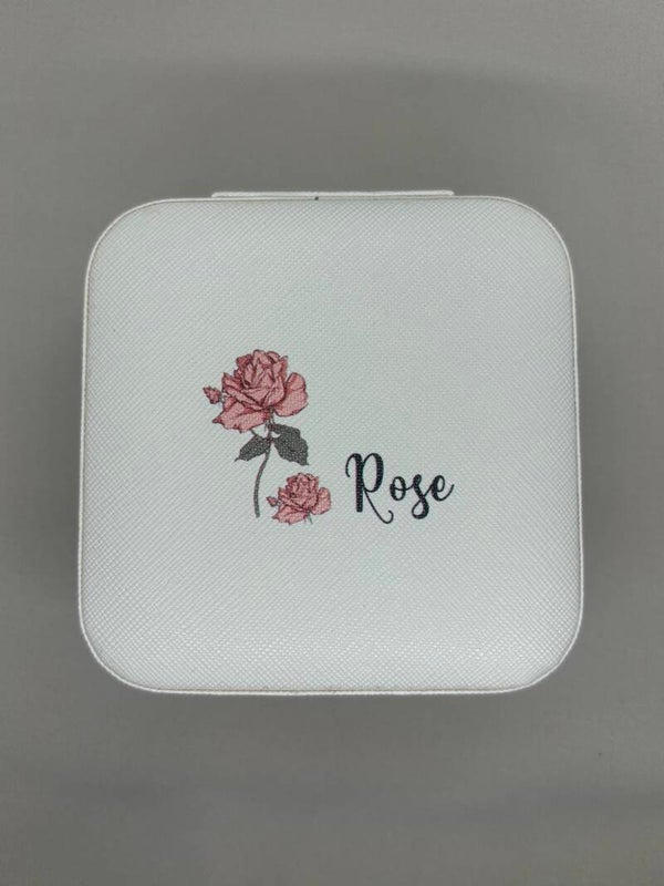 Petite boîte à bijoux personnalisée au prénom ainsi qu'avec la fleur de naissance de bébé (voir photos).