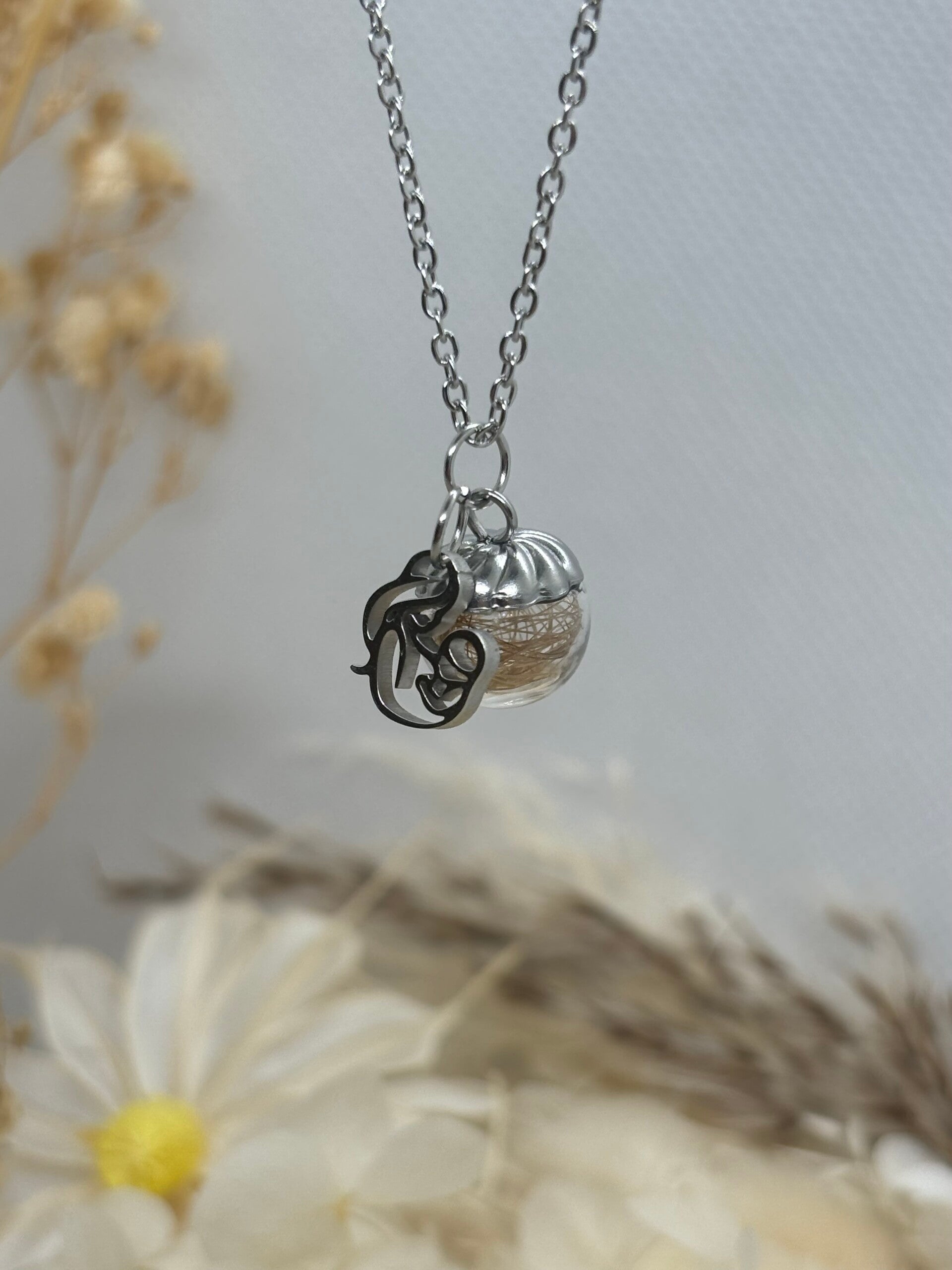 -une breloque avec perle en verre de 10 mm contenant une ou plusieurs mèches de cheveux (mélangées si plusieurs).