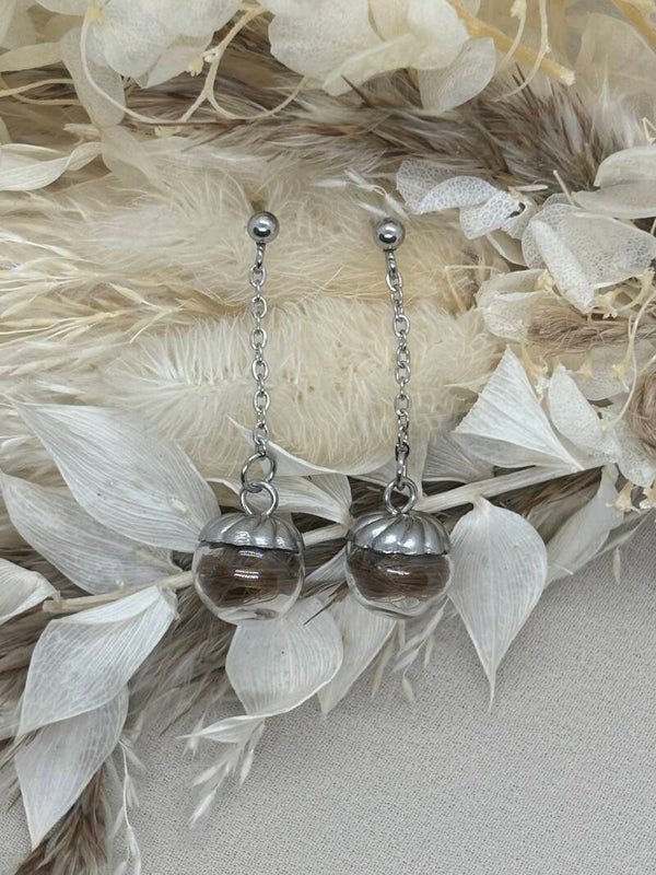 Boucles d'oreilles en acier inoxydable avec perle en verre contenant une ou plusieurs mèches de cheveux (mélangées si plusieurs).