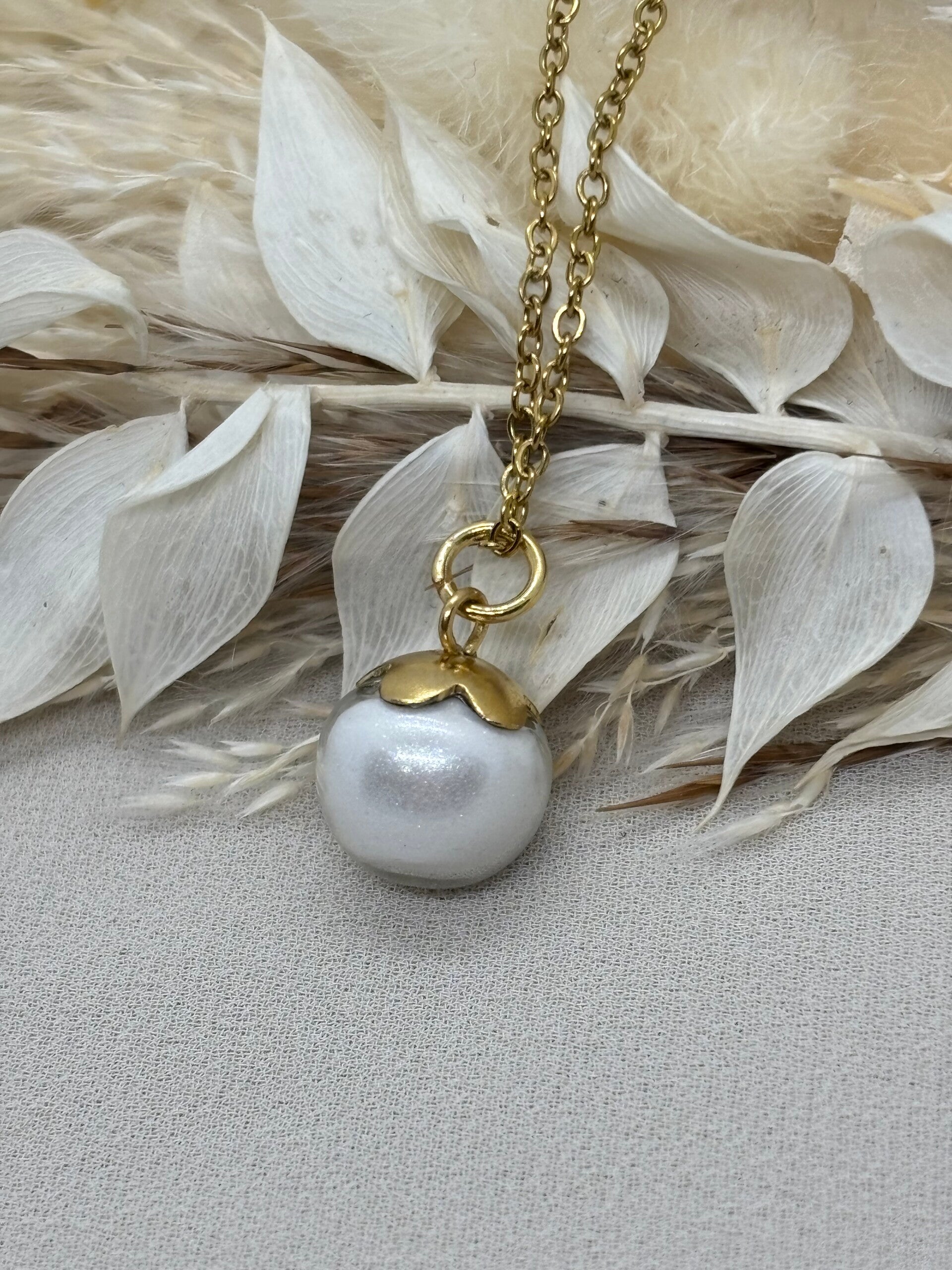 La perle étant en verre, ce bijou est fragile, nous vous recommendons d'y faire très attention et de ne le porter que pour des occasions spéciales. Néanmoins le bijou ne contenant pas de résine celui-ci est totalement résistant au UVs et il ne jaunira donc jamais !